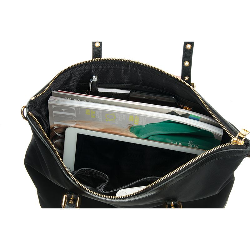 This handbag is a refined interpretation of classic black-and-gold styling, designed for brands seeking timeless elegance with reliable mass-production feasibility. Made with premium black 230D twill nylon and black PU leather, it balances structure, durability, and understated luxury. As a versatile handbag that transitions seamlessly between daily and business use, it fits well into mid- to high-end collections.