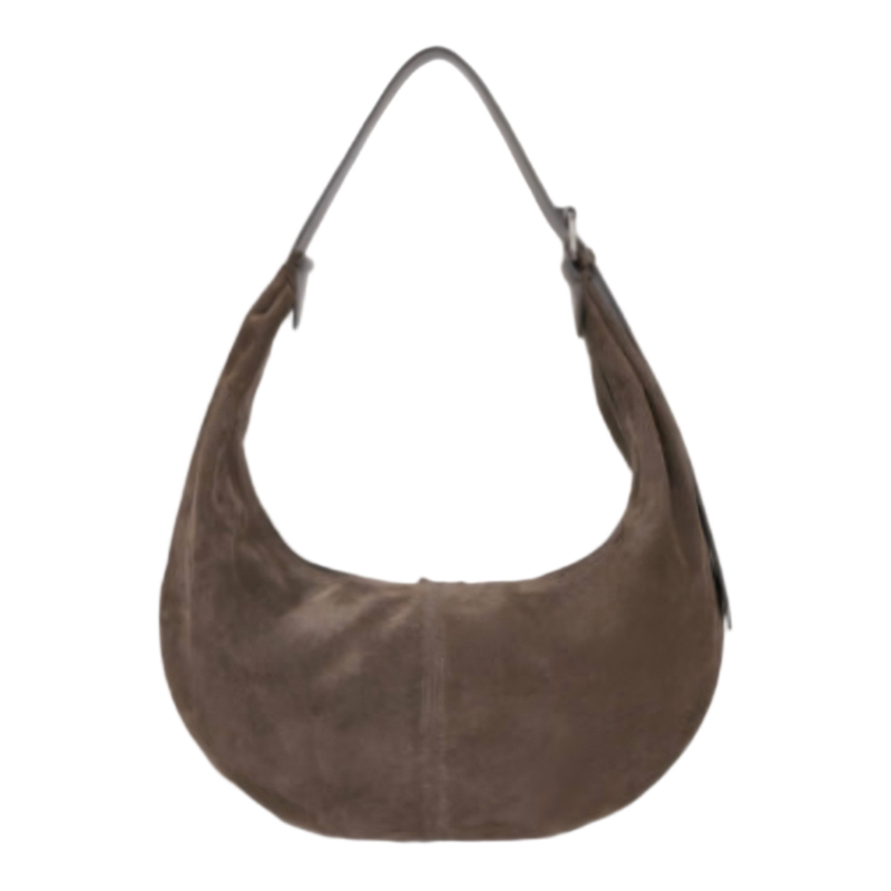 This brown suede hobo bag features a classic crescent shape with soft, rounded curves, giving it a natural, approachable feel. Ideal for creating a chic, sophisticated look, this handbag blends style with practicality, making it a timeless addition to any collection of women's handbags.