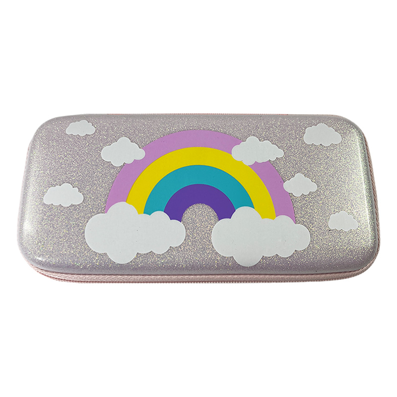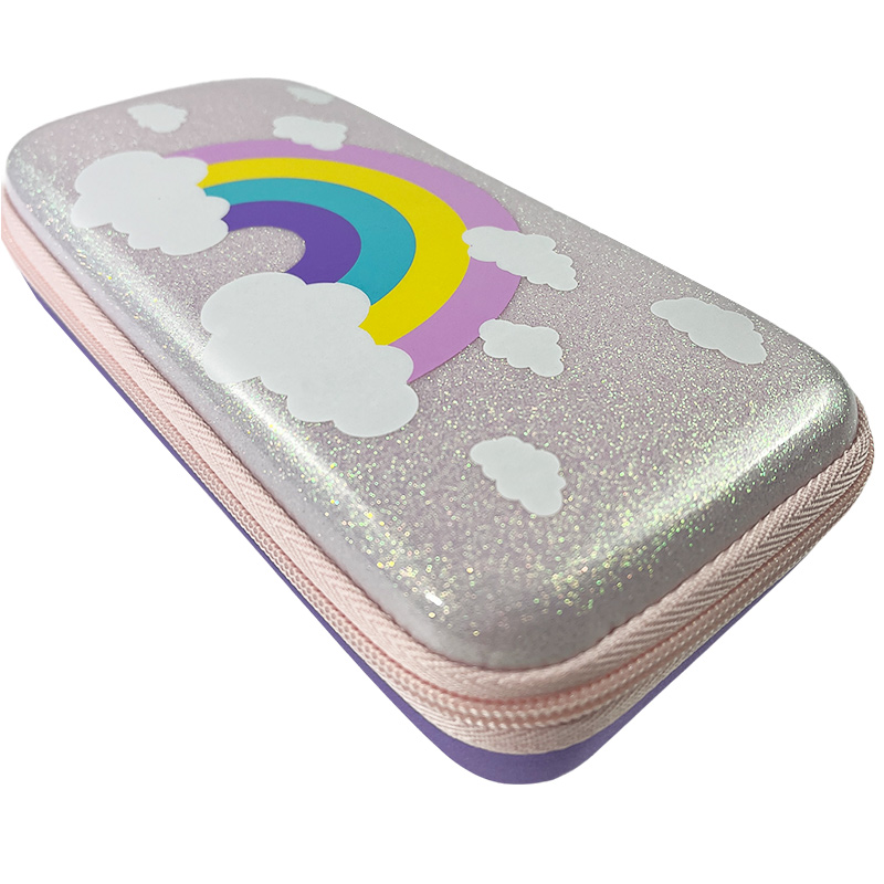 0.26 lbCrafted from high-quality EVA material, this pencil box features a shiny pink glitter exterior and a colorful rainbow design that adds a fun element to small girl's school gear. The purple jacquard fabric at the bottom contrasts beautifully with the top, creating a lively, energetic look.