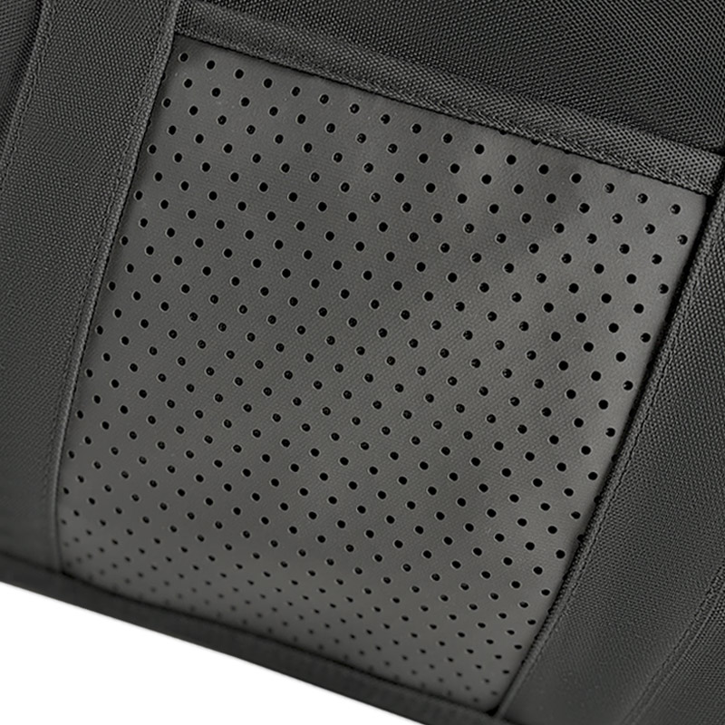 The front of the bag includes a convenient storage pocket made from breathable, perforated EVA fabric, giving the bag a unique and stylish appearance. This pocket is great for storing frequently used items such as your phone, keys, or other small essentials. On the left side, there's also a mesh pocket for small sports equipment or a water bottle, while the right side features a shoe compartment to keep your spare shoes separate from the rest of your belongings.