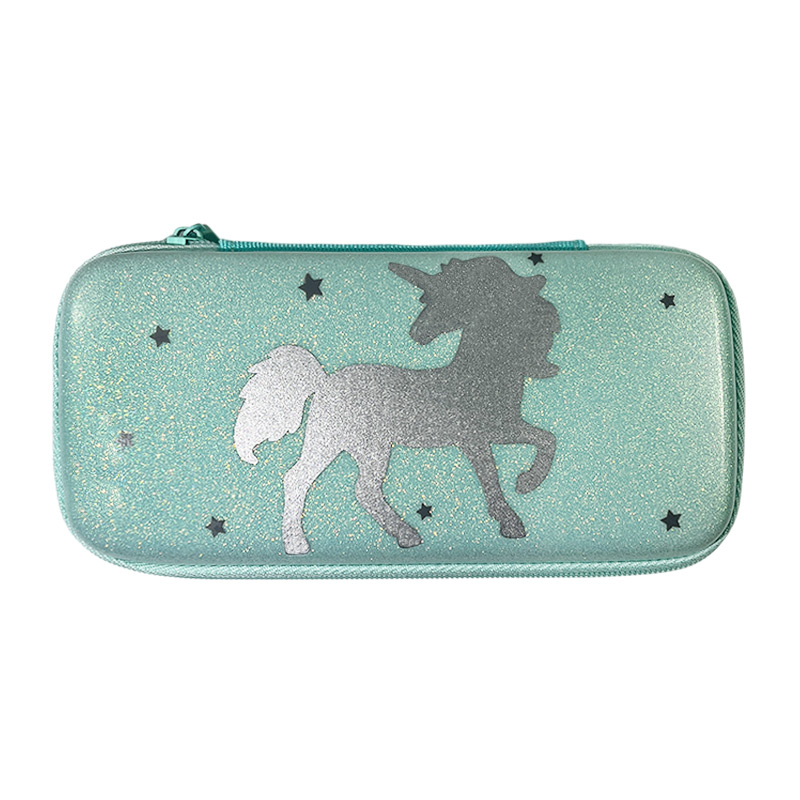 0.26 lbThe exterior of this pencil box features a glittery light green PU leather material, decorated with a silver unicorn design and a few small dark grey stars. This attention-grabbing design is perfect for adding a bit of magic to school life.